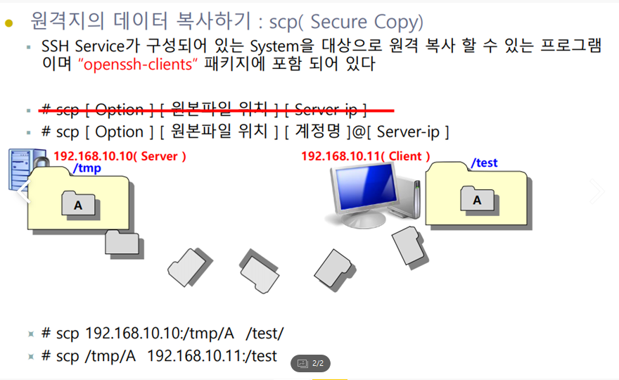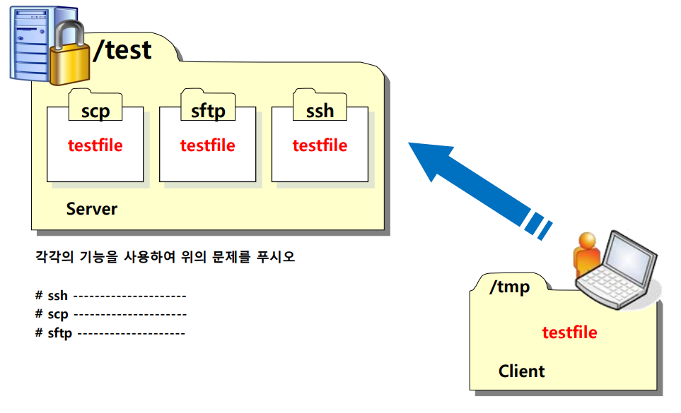 [root@localhost tmp]# sftp samadal@192.168.10.128 samadal@192.168.10.128's password: Connected to 192.168.10.128. sftp> pwd Remote working directory: /home/samadal sftp> put A Uploading A to /home/samadal/A A 100% 27 44.2KB/s 00:00 sftp> cd /test Can't change directory: "/test" is not a directory sftp> cd /tmp/test sftp> pwd Remote working directory: /tmp/test sftp> put A Uploading A to /tmp/test/A A 100% 27 159.4KB/s 00:00 sftp>업로드 하고자 할 때 위치를 입력하면 복사가 된다 put 명령어 사용