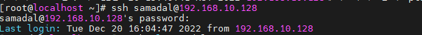 # ssh samadal@192.168.10.128 -> 지정된 사용자로 접속 확인 pts/2