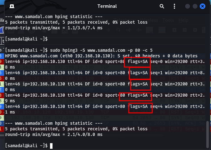 -> hping3 -S www.samadal.com -p 80 -c 5