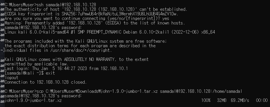 본체 cmd에서 scp 걸어야되는데 ssh 사용하려면 kali에서 openssh 깔아줘야함(apt -y install openssh-*)
